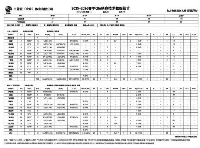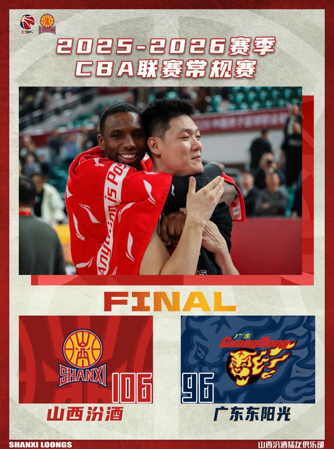 北京时间2026年4月20日19:35,2025-2026赛季常规赛第41轮继续进行,山西汾酒主场迎战广东东阳光。两队历史上共交手50次,山西汾酒10胜40负。上赛季两队交手7次,山西汾酒6胜1负;本赛季两队交手2次,山西汾酒0胜2负。本场比赛,山西队进攻端多点开花,全队六人得分上双,篮板球保护积极主动,但是对重点人的盯防仍需加强。末节关键时刻,本土球员挺身而出,接连得分帮助山西队稳住局面,拿下胜利。最终全场比赛结束,山西汾酒106:96战胜广东东阳光。