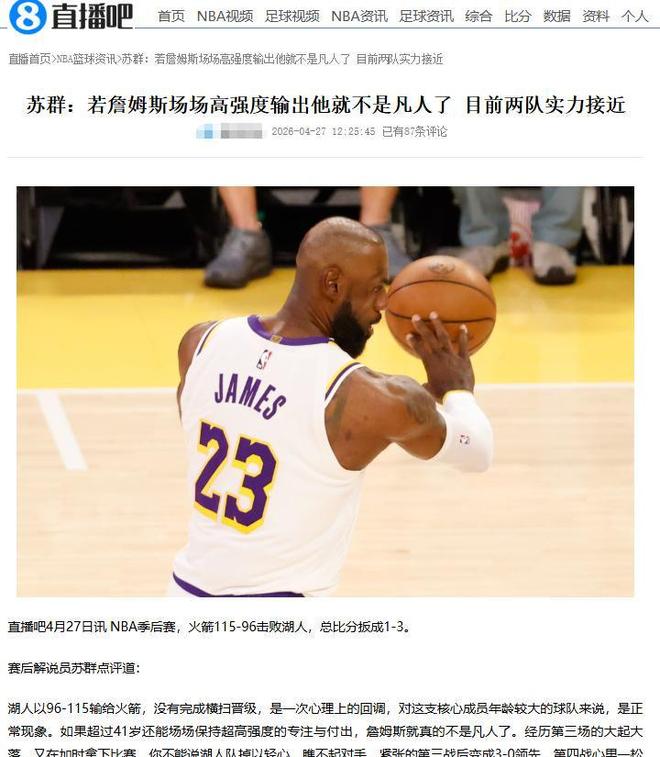 腾讯NBA:《拒绝横扫!火箭首发合砍95分 詹姆斯低迷9中2+8失误》2026年4月27日直播吧:《连续两场8失误!詹姆斯疲态尽显仍打33分钟 9中2仅得10分4板9助》2026年4月27日央视网:《詹姆斯109阿门237湖人客场惨败火箭总比分3-1》2026年4月27日新浪微博:《@苏群》直播吧:《苏群:若詹姆斯场场高强度输出他就不是凡人了 目前两队实力接近》2026年4月27日