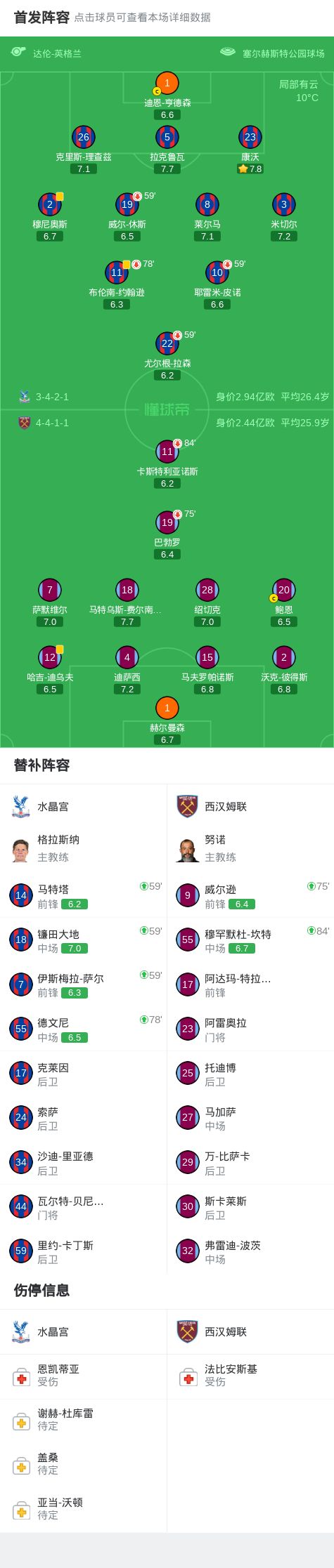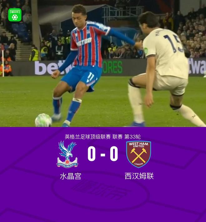 北京时间4月21日英格兰足球顶级联赛 联赛 第33轮,水晶宫主场对阵西汉姆联。最终比分水晶宫 0-0 西汉姆联。