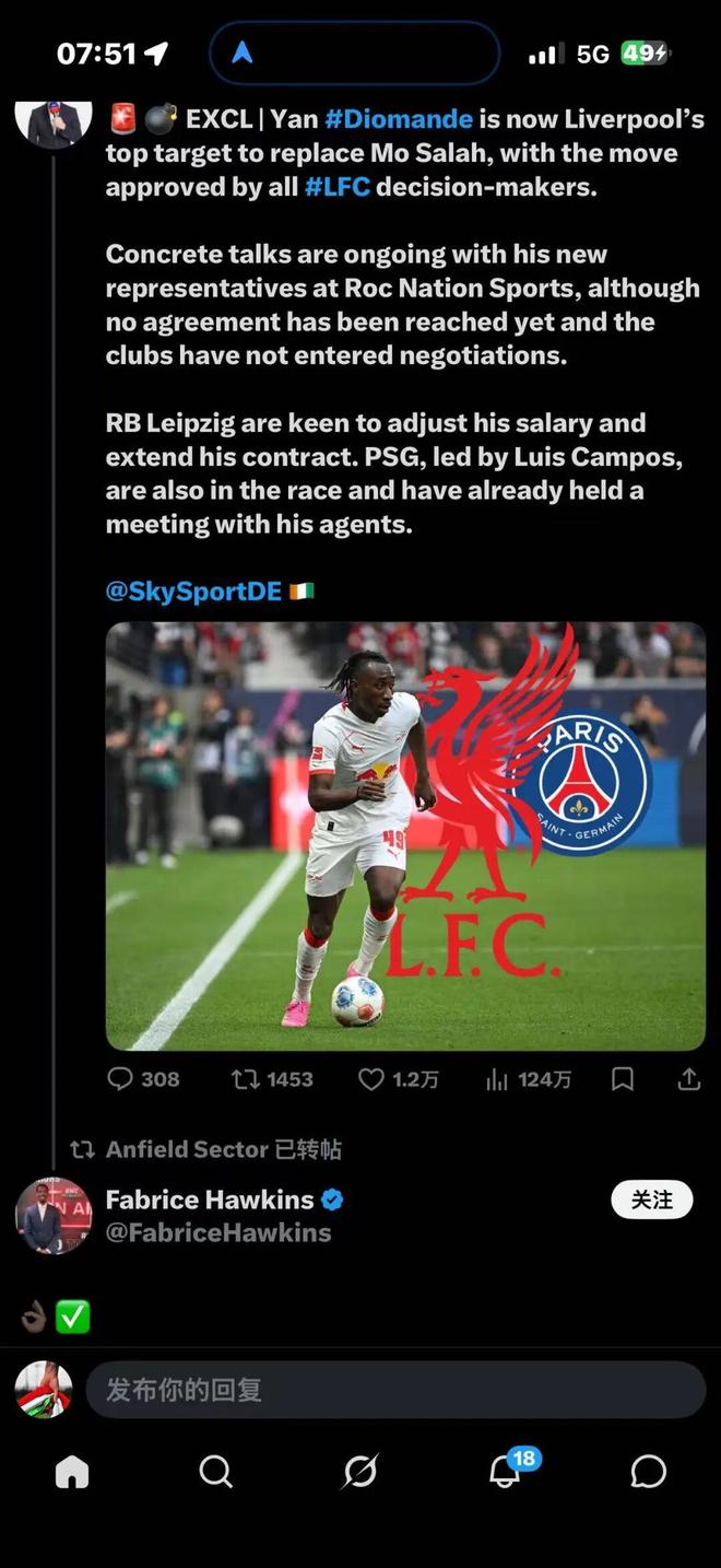 PJ与天体:随着埃基蒂克受伤,利物浦已启动与红牛边锋迪奥曼德的谈判。预计85m+。不过大巴黎也在虎视眈眈。