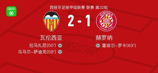 北京时间4月26日西班牙足球甲级联赛 联赛 第32轮,瓦伦西亚主场对阵赫罗纳。瓦伦西亚拉马扎尼破门,乌马尔-萨迪克破门。赫罗纳霍埃尔-罗卡破门。最终比分瓦伦西亚 2-1 赫罗纳。